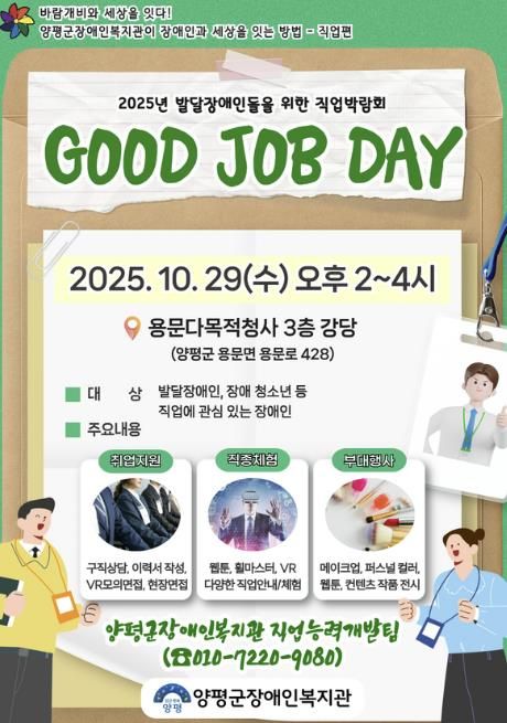 (플러스인뉴스) 대한불교조계종사회복지재단이 운영하는 양평군장애인복지관은 오는 29일 오후 2시부터 4시까지 용문다목적청사 3층 강당에서 발달장애인의 직업 탐색 기회를 지원하기 위한 직업박람회 ‘GOOD JOB DAY’를 개최한다.