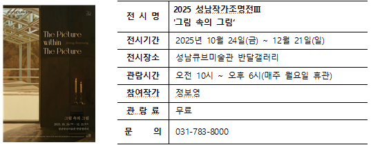 성남문화재단(대표이사 윤정국)은 지역의 역량 있는 작가들의 작품 세계를 집중 조명하는 기획전 2025 성남작가조명전의 세 번째 전시 ‘그림 속의 그림’을 10월 24일(금)부터 12월 21일(일)까지 성남큐브미술관 반달갤러리에서 개최한다.