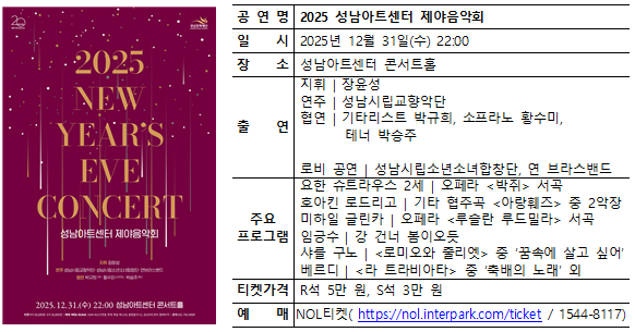 이번 ‘2025 성남아트센터 제야음악회’는 지휘자 장윤성이 이끄는 성남시립교향악단이 새해의 희망과 환희의 메시지를 전하는 클래식 프로그램을 선보이며, 여기에 세계적인 기타리스트 박규희, 국내외 무대에서 사랑받는 소프라노 황수미, 테너 박승주가 협연자로 나서 다채로운 무대를 보여줄 예정이다.