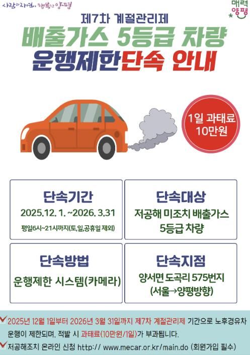 (플러스인뉴스) 양평군(은 오는 12월 1일부터 2026년 3월 31일까지 제7차 미세먼지 계절 관리제 시행에 따라 배출가스 5등급 차량에 대한 운행 제한 단속을 시행한다고 밝혔다.
