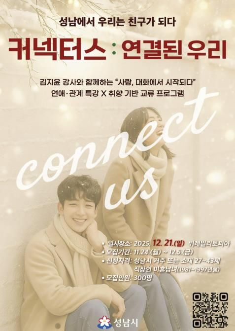 (플러스인뉴스) 성남시는 새로운 친구를 만들 수 있는 청년 교류 행사 ‘커넥터스(Connect-us) 연결된 우리’ 참가 희망자 300명을 오는 12월 5일까지 모집한다.