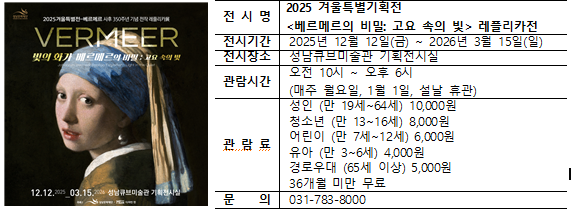 성남문화재단(대표이사 윤정국)은 네덜란드를 대표하는 거장 요하네스 베르메르의 예술세계를 조망하는 겨울 특별기획전 ‘베르메르의 비밀: 고요 속의 빛’ 레플리카 전시를 12일(금)부터 내년 3월 15일(일)까지 성남큐브미술관 기획전시실에서 개최한다.
