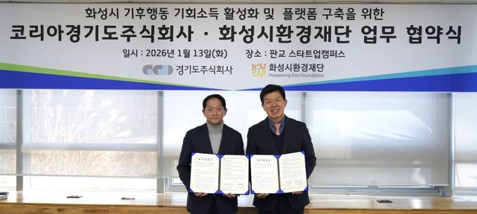 (플러스인뉴스) 경기도주식회사는 13일 경기도 성남시 판교 스타트업캠퍼스에서 화성시환경재단과 ‘기후행동 기회소득 활성화 및 화성시 플랫폼 구축을 위한 업무협약’을 체결했다.