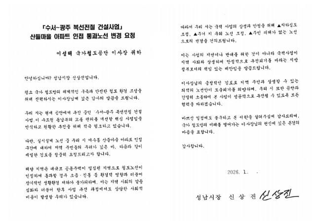 (플러스인뉴스) 성남시는 지난 16일 김윤덕 국토교통부 장관과 이성해 국가철도공단 이사장에게 ‘수서~광주 복선전철(이하 수광선) 건설사업’과 관련하여 여수동 산들마을 아파트 인접 통과 구간의 노선 변경을 요청하는 서한을 전달했다고 20일 밝혔다.