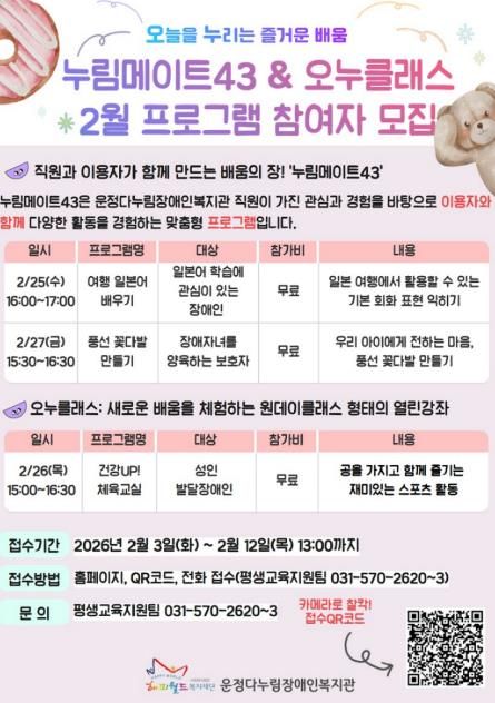 (플러스인뉴스) 파주시 운정다누림장애인복지관은 참여형 평생학습 프로그램 ‘누림메이트43’을 운영하며, 정규 강좌로는 담기 어려운 소규모 학습 수요를 반영한 생활 밀착형 배움을 실천하고 있다.