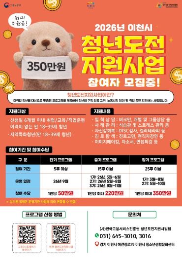 청년도전지원사업은 고용노동부와 이천시가 함께 추진하는 맞춤형 청년취업 지원사업으로, 장기간 구직활동에 어려움을 겪고 있는 청년들이 다시 노동시장에 진입할 수 있도록 돕는 프로그램이다. 참여 대상은 최근 6개월 이내 취업 또는 직업훈련 이력이 없는 19세부터 34세 이하 청년이다.