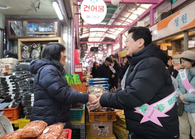 이 시장은 이날 부인 김미영 여사와 용인을 대표하는 전통시장인 용인중앙시장을 찾아 과일, 떡, 전, 빵 등을 구매하며 장을 보러 온 시민, 상인과 정담을 나눴다.