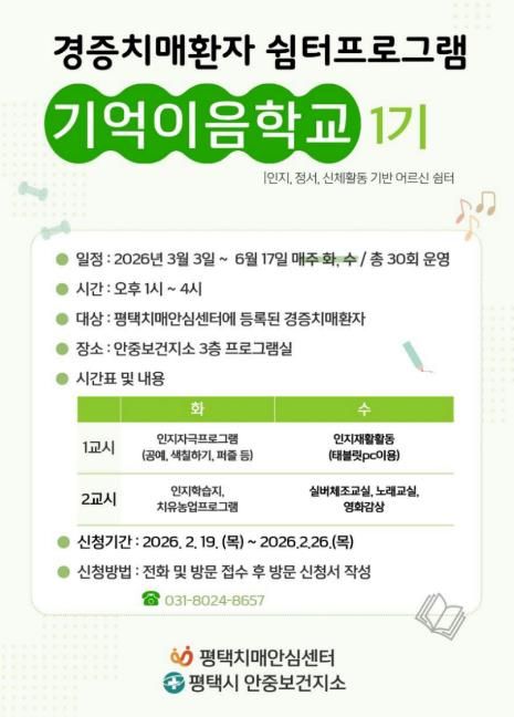 (플러스인뉴스) 평택시 안중보건지소는 경증 치매 환자의 인지기능 유지와 일상생활 지원을 위해 오는 3월 3일부터 6월 17일까지 경증 치매 환자 쉼터 프로그램 ‘기억이음학교 1기’를 운영한다.