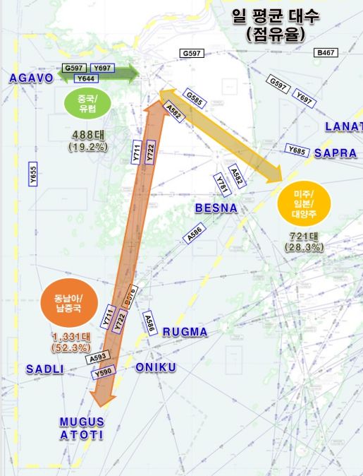 주요 공항별로는 인천공항이 일평균 1,193대(전년대비 2.8%↑)로 가장 많은 교통량을 기록했으며, 제주공항 487대(0.4%↓), 김포공항 390대(0.2%↓) 순으로 나타났다.