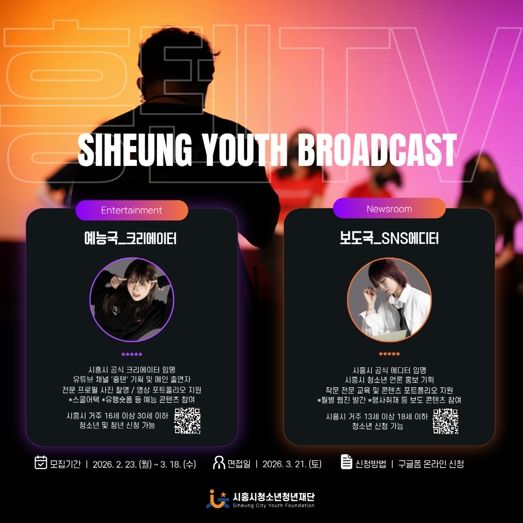 (플러스인뉴스) 시흥시청소년청년재단은 시흥시 청소년ㆍ청년의 미디어 활동 역량을 강화하고, 재단의 소통 기능을 확대하기 위해 ‘흥텐TV’를 운영하는 가운데, ‘흥텐TV’를 함께 이끌어갈 예능국·보도국 신규 단원을 3월 18일까지 모집한다.