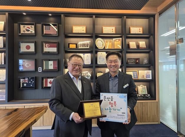 이학현 문산읍장은 “기업의 성장과 더불어 지역사회를 돌보는 사회적 책임을 실천해 주신 한울생약㈜에 깊이 감사드린다”라며 “이번 현판식이 나눔의 가치를 널리 알리고 더 많은 사업장이 동참하는 계기가 되길 바란다”라고 말했다.