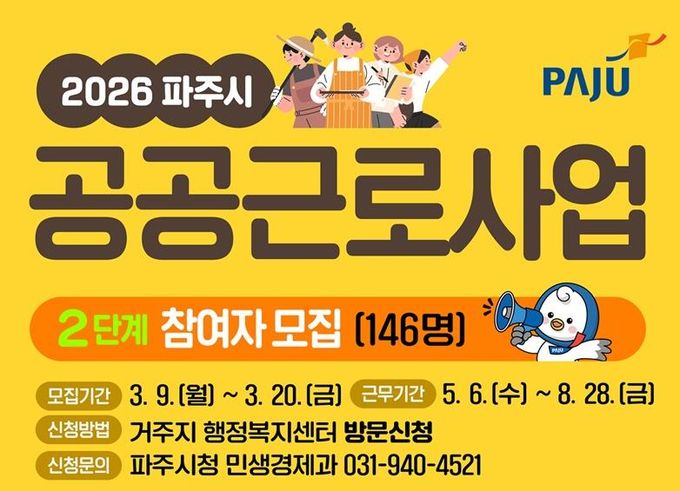 (플러스인뉴스) 파주시가 오는 20일까지 2026년 2단계 공공근로사업 참여자 146명을 모집한다.