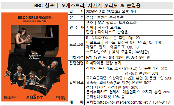 성남문화재단(대표이사 윤정국)이 영국을 대표하는 명문 악단 ‘BBC 심포니 오케스트라, 사카리 오라모 & 손열음’ 공연을 오는 3월 28일(토) 오후 5시 성남아트센터 콘서트홀에서 개최한다.