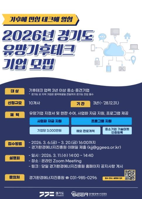(플러스인뉴스) 경기도와 경기환경에너지진흥원이 기후위기 대응을 선도할 혁신 기술 보유 기업을 발굴하기 위해 오는 3월 20일까지 ‘2026년 경기도 유망 기후테크 기업’ 10곳을 모집한다.