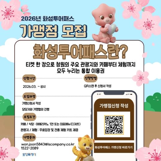 화성특례시 관계자는 “다채롭고 개성 있는 지역 업체들을 발굴해 관광객들에게 화성의 숨겨진 매력을 널리 알리고자 한다”며, “지역 소상공인과 상생할 수 있는 화성 투어패스 가맹점 모집에 많은 관심과 참여를 부탁드린다”고 전했다.