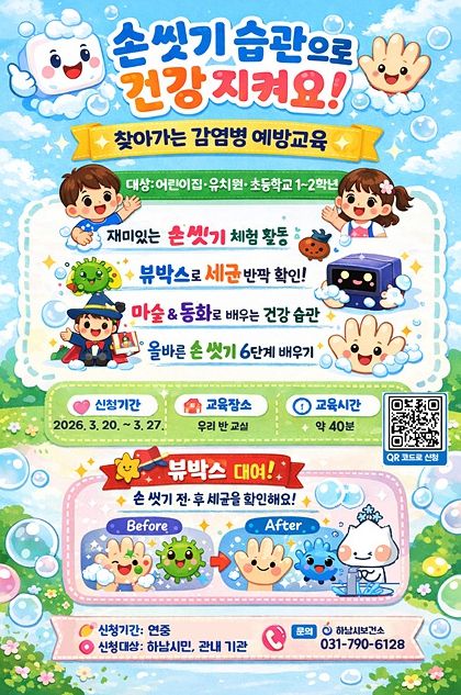 (플러스인뉴스) 하남시보건소는 오는 4월 6일부터 10월 2일까지 관내 어린이 대상 ‘손 씻기 교육’을 운영하며, 3월 20일부터 27일까지 관내 교육기관을 대상으로 네이버 폼을 통해 교육 신청을 받는다고 밝혔다.