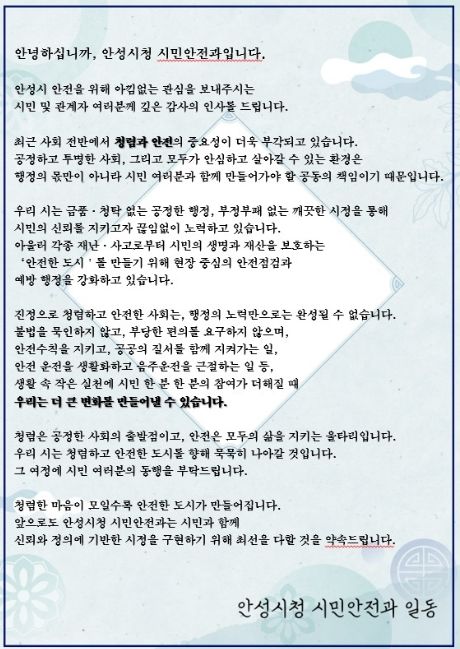 특히 안내문에는 부정청탁 금지 등 청렴 관련 내용뿐만 아니라 안전운전 캠페인, 음주운전 근절 등 안전의식 제고를 위한 내용도 함께 담아, 시민들의 일상 속 청렴과 안전의식을 동시에 높인다는 계획이다. 안내문은 A4 형태로 제작되며, 필요 수량만 산정해 제작함으로써 자원 절약에도 기여할 방침이다.