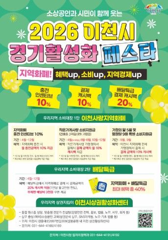 (플러스인뉴스) 이천시는 침체된 지역경제에 활력을 불어넣기 위해 2026년 4월 3일부터 ‘2026 이천시 경기 활성화 페스타’를 본격 추진한다고 밝혔다.