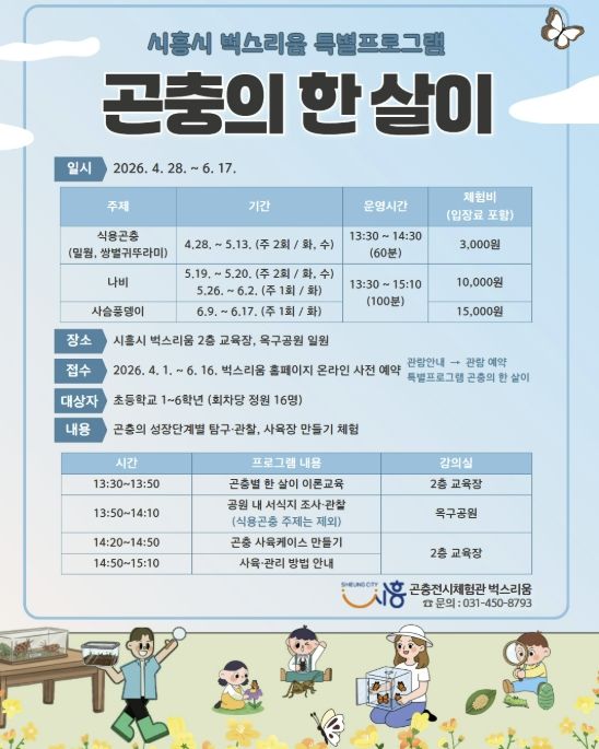 (플러스인뉴스) 시흥시 곤충체험전시관 ‘벅스리움’은 오는 4월 28일부터 6월 17일까지 초등학생을 대상으로 특별프로그램 ‘곤충의 한 살이’를 운영한다.