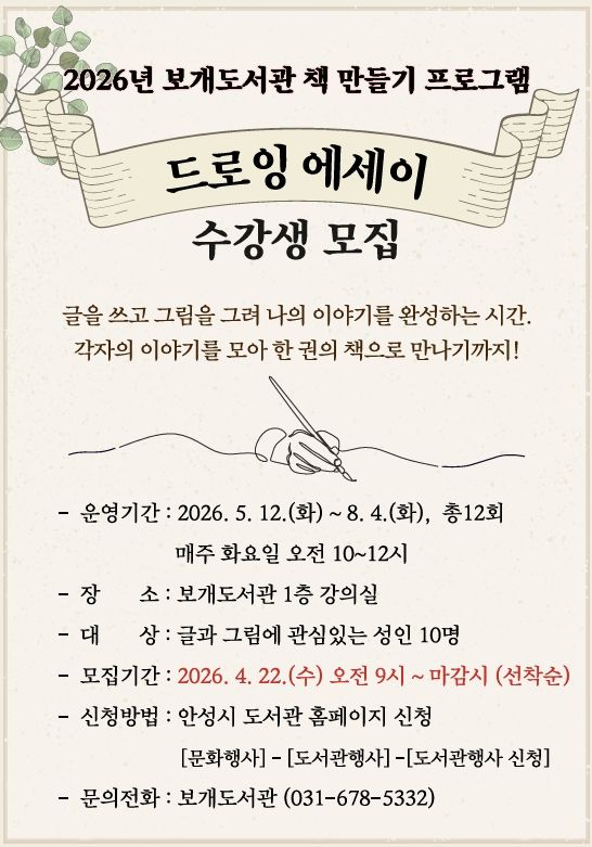 (플러스인뉴스) 안성시 보개도서관(책문화센터)이 시민들의 창작 활동을 지원하고 일상 속 예술 경험을 확대하기 위해 오는 5월부터 ‘드로잉 에세이’와 ‘포토 에세이’ 책 만들기 프로그램을 새롭게 운영한다고 밝혔다.