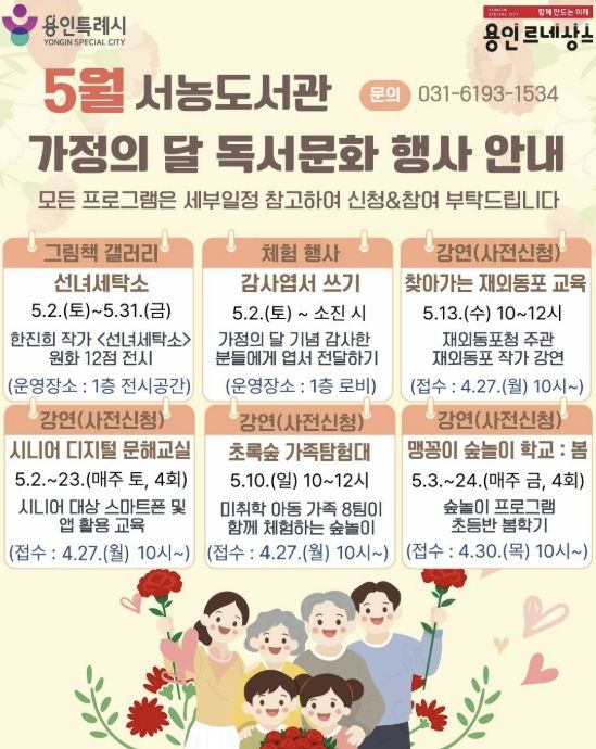 (플러스인뉴스) 용인특례시 서농도서관은 오는 5월 가정의 달을 맞아 다양한 세대를 아우르는 프로그램으로 이뤄진 ‘2026년 5월 독서문화행사’를 마련했다고 21일 밝혔다.