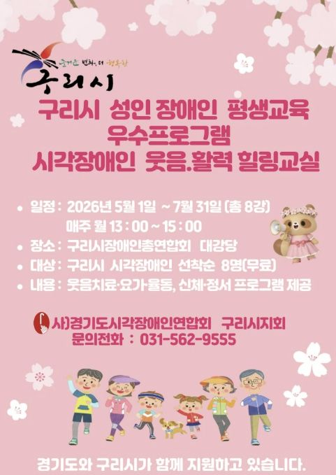 (플러스인뉴스) 사단법인 경기도시각장애인연합회 구리시지회는 구리시와 경기도의 지원을 받아 2026년 5월부터 ‘시각장애인 웃음·활력 힐링 교실’을 운영할 예정이라고 밝혔다.