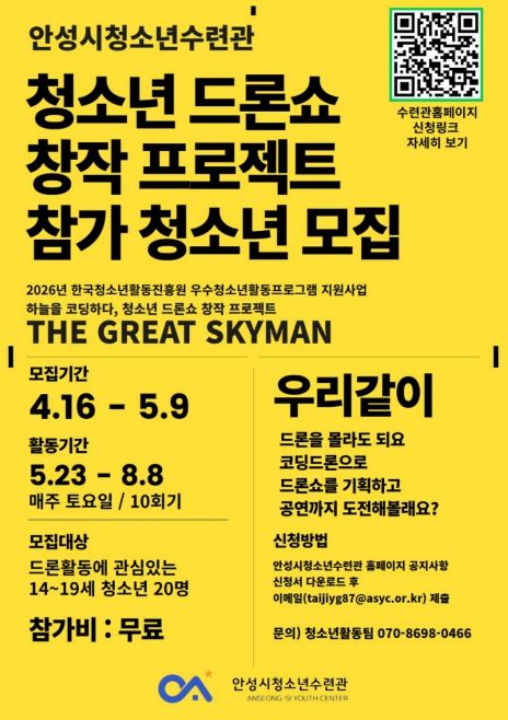 (플러스인뉴스) 안성시청소년수련관은 미래 디지털 인재 양성을 위한 청소년 참여형 프로그램 '하늘을 코딩하다, 청소년 드론쇼 창작 프로젝트 ‘THE GREAT SKYMAN’'에 참여할 청소년을 4월 16일 ~ 5월 8일까지 모집한다고 밝혔다.