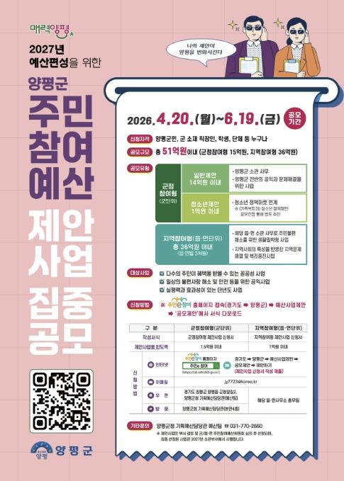 (플러스인뉴스) 양평군은 오는 6월 19일까지 2027년 예산에 반영할 ‘주민참여예산 제안사업’을 집중 공모한다고 밝혔다.