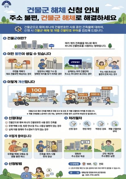 (플러스인뉴스) 양평군은 건물군으로 묶여 하나의 건물번호만 사용하고 있는 건축물을 대상으로 건물군 해체 및 개별 건물번호 부여를 추진해 군민의 주소 사용 불편을 해소할 계획이라고 밝혔다. 이번 사업은 국민불편사항 개선 과제의 일환으로 추진되며, 실제 이용 형태와 맞지 않는 주소 체계를 정비해 보다 정확한 주소 사용 환경을 조성하기 위해 마련됐다.
