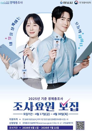 (플러스인뉴스) 하남시는 4월 17일부터 30일까지 ‘2025년 기준 하남시 경제총조사’ 수행을 위한 조사요원을 모집한다고 밝혔다.