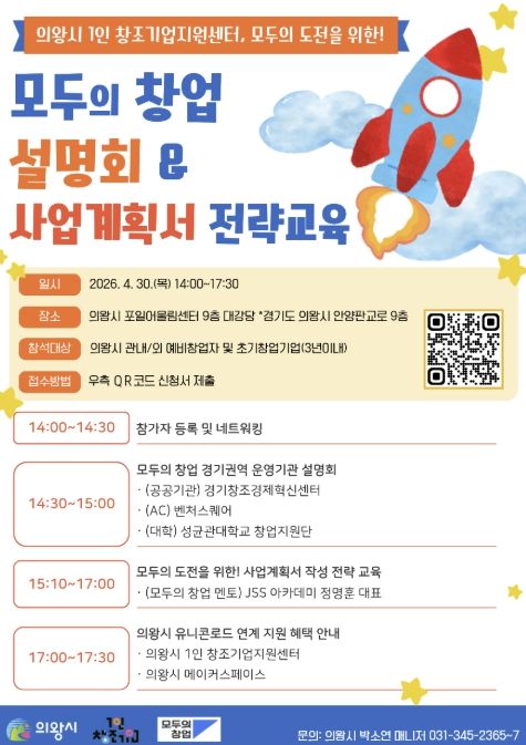 이번 ‘모두의 창업 설명회 및 전략교육’은 의왕시 포일어울림센터 9층 대강당에서 진행되며, 예비 창업자와 초기 창업 기업의 실질적인 사업화 역량 강화를 목표로 한다.