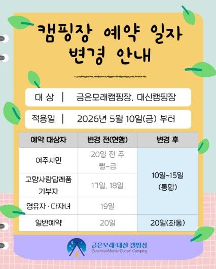 기존에 대상별로 달랐던 여주시민, 고향사랑답례품, 영유아·다자녀 가정의 예약 일정을 매월 10일부터 15일까지로 통합한다. 일반예약은 기존과 동일하게 매월 20일부터 시작하여 이용객의 혼선을 최소화했다고 밝혔다.