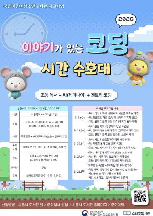 (플러스인뉴스) 시흥시 소래빛도서관은 국립어린이청소년도서관이 주최하는 ‘2026년 이야기가 있는 코딩’ 공모사업 운영기관으로 선정돼 오는 5월 6일부터 어린이 대상 독서·디지털 융합 프로그램을 운영한다.