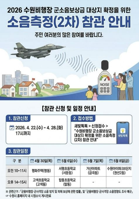 (플러스인뉴스) 수원특례시가 수원비행장 인근 주민들의 소음 피해 보상 근거가 될 국방부의 ‘수원비행장 소음 영향도 조사 2차 소음측정’ 주민 참관 참여자를 모집한다. 4월 28일까지 새빛톡톡으로 신청할 수 있다.