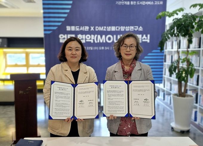 (플러스인뉴스) 파주시 월롱도서관은 지난 22일 디엠지(DMZ)생물다양성연구소와 지역사회 독서진흥 및 생태환경 분야 협력을 위한 업무협약을 체결했다.