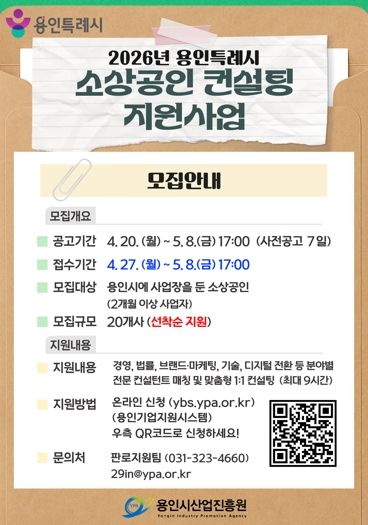 (플러스인뉴스) 용인특례시와 용인시산업진흥원은 ‘2026년 용인시 소상공인 창업 및 경영 컨설팅 지원사업’에 참여할 소상공인을 모집한다고 26일 밝혔다.
