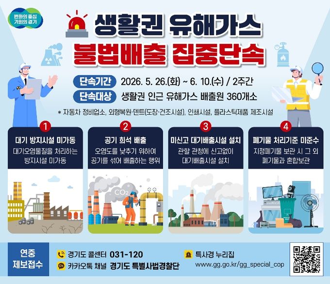 (플러스인뉴스) 경기도 특별사법경찰단이 5월 26일부터 6월 10일까지 2주간 주거지·학교·병원 등 생활권 인근 지역의 유해가스 배출 사업장을 대상으로 불법행위를 집중단속 한다.