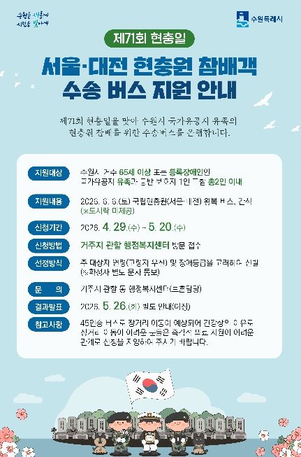 (플러스인뉴스) 수원특례시가 제71회 현충일인 6월 6일, 국립현충원(서울·대전)까지 이동이 여의치 않은 국가유공자 유족을 위해 현충원 왕복 수송버스를 운행한다.