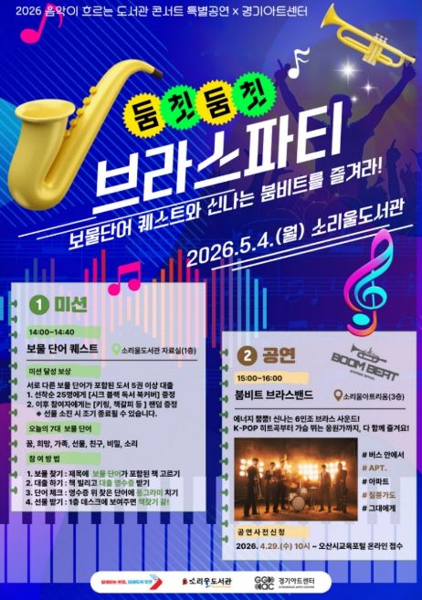 (플러스인뉴스) 오산시 소리울도서관은 제104회 어린이날을 앞둔 오는 5월 4일 경기아트센터와 협업해 ‘2026 음악이 흐르는 도서관 콘서트’ 특별공연인 ‘둠칫둠칫 브라스 파티’를 개최한다고 밝혔다.