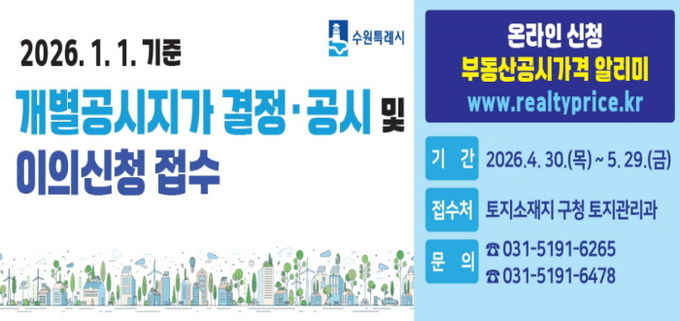 공시된 개별공시지가는 부동산공시가격알리미 홈페이지를 통해 열람 및 이의신청이 가능하며, 권선구청 토지관리과를 방문해 열람하거나 이의신청을 할 수 있다.