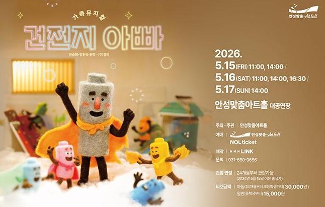 가족뮤지컬 '건전지 아빠'는 5월 15일부터 17일까지 3일간 무대에 오른다. 매일 조금씩 지쳐가는 일상에서 잠시 멈춰 서고 싶은 모든 가족에게, 이 공연은 서로의 손을 맞잡고 다시 나아갈 힘을 채워주는 가장 따뜻한 ‘가족 충전소’가 될 것이다.