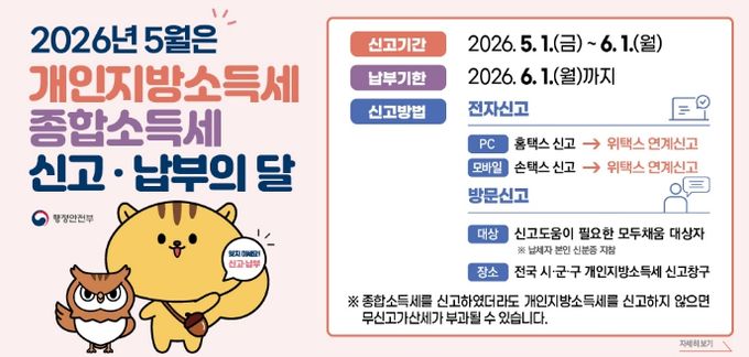 종합소득세는 2025년에 발생한 사업소득, 근로소득, 이자·배당소득, 연금소득, 기타소득 등을 합산해 신고하는 세금이다. 개인지방소득세는 종합소득세의 10%에 해당하는 지방세로, 종합소득세 신고와 함께 5월 1일부터 6월 1일까지 신고·납부해야 한다.