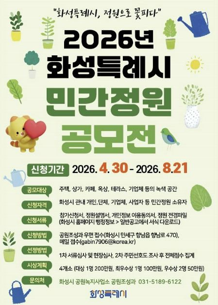 (플러스인뉴스) 화성특례시가 ‘정원으로 꽃피는 화성’을 만들기 위해 관내의 아름답고 가치 있는 민간정원을 발굴하는 ‘2026년 화성특례시 민간정원 공모전’을 개최한다.