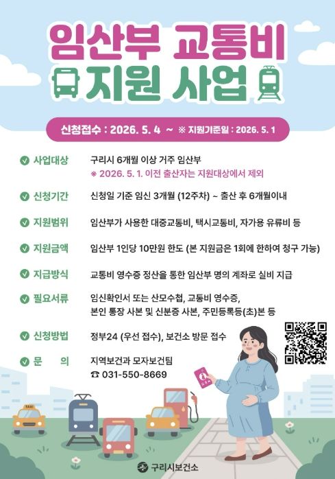 구리시 관계자는 “임산부의 경제적 부담을 줄이고 안전한 이동을 지원하기 위한 정책”이라며, “대상자들의 많은 관심과 신청을 바란다.”라고 말했다.