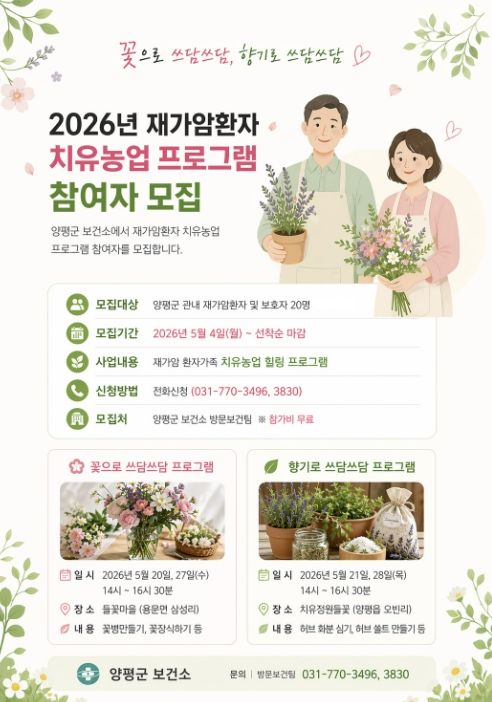 (플러스인뉴스) 양평군보건소는 재가암환자와 돌봄 가족의 정서적 안정과 건강 회복을 지원하기 위해 ‘2026년 재가암환자 치유농업 프로그램’ 참여자를 오는 5월 4일부터 모집한다고 밝혔다.