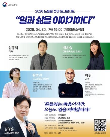 (플러스인뉴스) 고용노동부는 4월 30일 저녁 7시, 서울 마포구 소재 ‘구름아래소극장’에서 청년 200여 명과 함께 일에 대한 고민을 나누며, 노동의 가치를 다시 한번 생각해 보는'일과 삶을 이야기하다' 토크콘서트를 개최했다고 밝혔다.