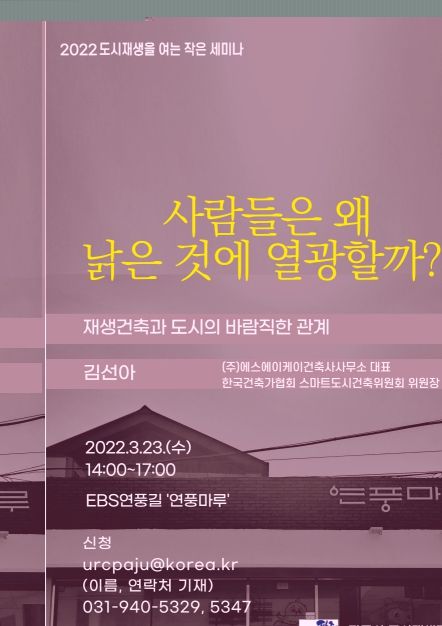 강의는 낡음을 감추기보다 드러내는 리모델링 건축 현상을 중심으로 건축이 도시에 개입하는 방식을 살펴보고 재생건축과 도시의 바람직한 관계를 모색하고자 마련됐다. 이 자리에는 강연과 더불어 파주시민의 다양한 의견을 들을 수 있는 주민참여형 워크숍과 자유로운 토론도 함께 진행된다.