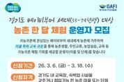 (플러스인뉴스) 경기도와 경기도농수산진흥원은 ‘경기도 베이비부머 농촌 한 달 체험’을 운영할 마을·단체 2곳을 오는 18일까지 모집한다. 경기도귀농귀촌지원센터의 심사를 거쳐 선정된 체험 마을·단체 한 곳당 5개 팀을 맡게 되며, 체험 운영 역량 강화를 위한 멘토 교육과 프로그램 참가자 1팀당 최대 200만 원의 운영비가 지원된다. 마을·단체는 귀농·귀촌을 준비하는 베이비부머 세대(1955~1974년생)가 한 달간 농촌에 거주하며 영농실습과 지역민 교류를 체험할 수 있도록 임시 주거지와 교육 프로그램을 제공해야 한다. 귀농·귀촌 교육 및 숙박이 가능한 도내 농촌 마을·단체라면 경기도귀농귀촌지원센터 누리집에서 내려받은 신청 서식을 전자우편으로 제출해 신청할 수 있다. 기타 자세한 사항은 누리집 공고문이나 전화 문의를 통해 확인 가능하다. 최창수 경기도농수산진흥원장은 “베이비부머 세대가 막연한 귀농·귀촌이 아닌, 충분한 체험과 준비 과정을 거쳐 안정적으로 정착할 수 있도록 지원하겠다”며 “역량 있는 마을의 많은 참여를 기대한다”고 말했다. [뉴스출처 : 경기도청]
