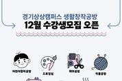 (플러스인뉴스) 경기문화재단 경기상상캠퍼스(대표이사 유정주)는 겨울 시즌 생활창작공방 프로그램 참여자를 오는 17일부터 모집한다. 생활창작공방은 경기상상캠퍼스 생생1990에 위치한 경기생활문화센터 교육 커뮤니티 공간으로, 도민이 일상 속에서 다양한 창작 활동을 경험할 수 있도록 재단공방, 어린이창작공방, 드로잉실, 취미공방, 직물공방, 커피공방, 사진촬영실까지 총 7개의 특화 공간을 운영하고 있다. 11월에는 총 11개의 프로그램이 구성돼 있으며, 주요 프로그램으로는 △Set in wool(울조끼와 가방 만들기), △오롯이 나에게 집중하는 시간: 4주 터프팅 힐링 프로젝트, △내 생애 첫 그림- 알기 쉬운 민화'일월오봉도', △그림책 마음 놀이터 등이 있다. 12월에는 △오일파스텔로 만드는 2026년 달력 △우리들의 예술놀이터, △복을 담는 라탄 복조리 만들기, △복을 쓸어 담는 모시 빗자루 만들기, △커피의 감별과 추출 방법: 커핑까지 총 5개의 프로그램이 운영될 예정이며, 수강 신청은 11월 14일부터 각 프로그램 시작 4일 전까지 경기상상캠퍼스 누리집을 통해 가능하다. 경기상상캠퍼스 내 생활창