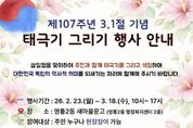 (플러스인뉴스) 영통구 영통2동은 영통2동 새마을문고가 제107주년 3·1절을 맞아 지역 주민과 함께 독립운동의 뜻을 기리고 나라사랑의 의미를 되새기기 위한 ‘태극기 그리기’ 행사를 운영한다고 밝혔다. 이번 행사는 오는 3월 18일까지 매일 오전 10시부터 오후 5시까지 영통2동 새마을문고에서 진행되며, 전 연령대 누구나 현장 접수를 통해 참여할 수 있다. 참가자들은 직접 태극기와 무궁화를 그리며 3·1운동 정신을 생활 속에서 체험하는 시간을 갖는다. 제출 시 룰렛 돌리기를 통해 소정의 상품도 증정할 예정이다. 영통2동 새마을문고는 앞으로도 독서문화 활동과 연계한 다양한 생활문화 프로그램을 통해 주민 참여의 장을 넓히고, 지역의 역사·문화 가치를 함께 나누는 활동을 이어갈 계획이다. [뉴스출처 : 경기도 수원시]